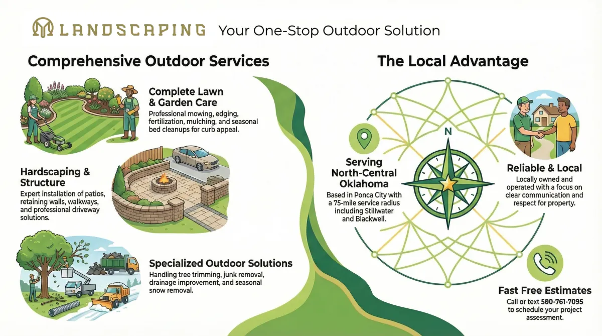 We’re a local, Ponca City‑based business—so we understand the soil, weather, and neighborhood standards that matter to you, your renters, and your customers.